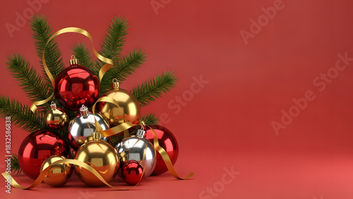 Christmas ornaments arrangement with festive golden ribbons and pine branches perfect for holiday greetings and seasonal designs