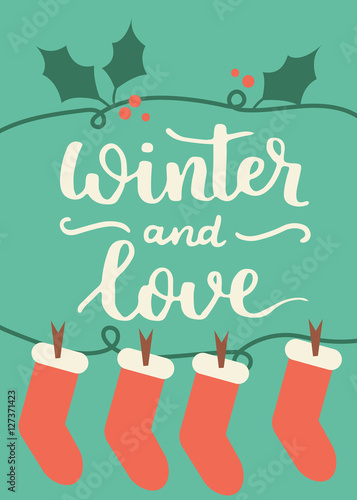 Christmas poster with lettering Winter and love and christmas socks. Cute decorative background for your design.