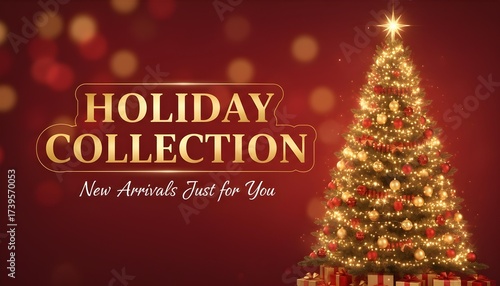 Christmas product promotion banner with glowing decorations, Christmas tree, and festive holiday collection, perfect for seasonal marketing, online sales, and festive advertising campaigns.