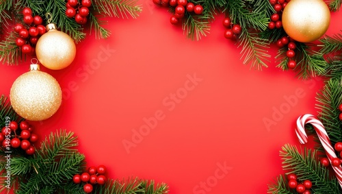 Christmas Red Background with Gold Ornaments, Holly Berries & Candy Cane