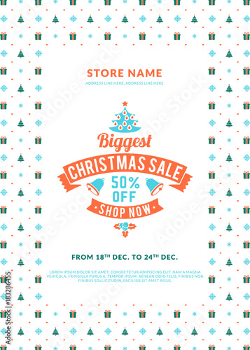 Christmas sale poster or flyer design. Discount offer. Vintage badge with winter background