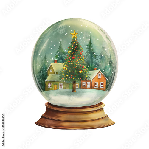 Christmas snow globe with colorful houses and pine trees. Winter holiday ornament concept.