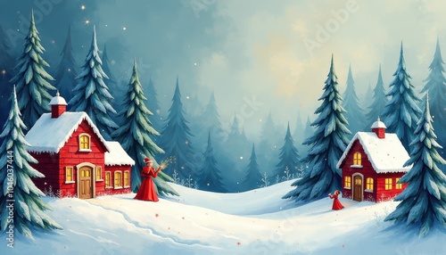 Christmas stuff Christmas village models, snow-topped trees, carolers.