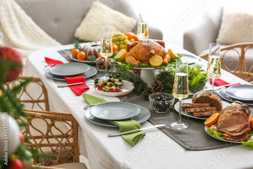 Christmas table setting with tasty ham and bread in dining room, closeup