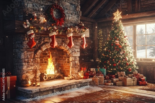 Christmas tree Beautiful decorated fireplace and Christmas tree at cottage Christmas tree