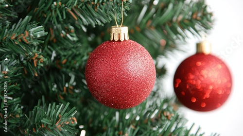 Christmas tree background with red christmas ball on white background.Selective focus.