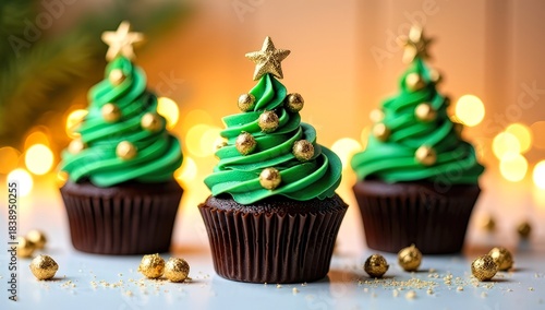 Christmas Tree Cupcakes with Green Frosting and Gold Decor