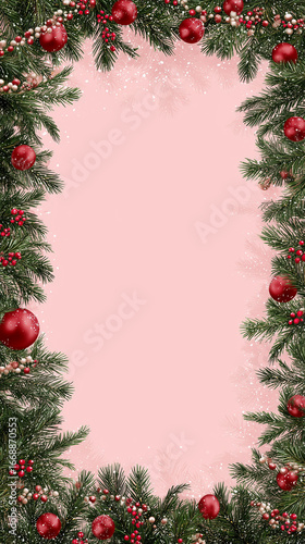 Christmas Tree Frame with Garland and Red Ornaments on Pink Background – Vector Card Template with Text Space