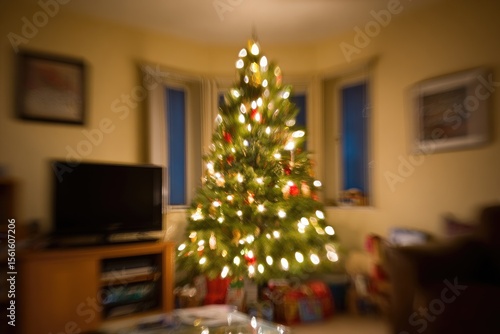 Christmas tree in a cozy living room, softly lit