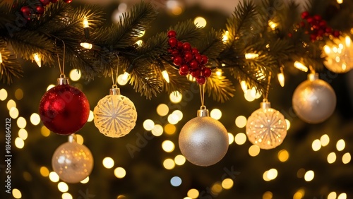 Christmas tree lights with ornaments, warm golden bokeh glow, cozy festive winter holiday background