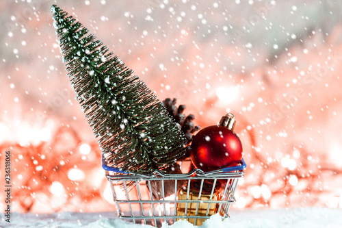 Christmas tree on snow with gift and light bokeh backgrounds ,Snowy Christmas or New Year festive background