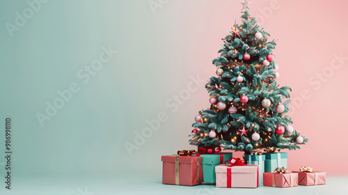 Christmas tree with gift under the tree. Copy space for text. Christmas background