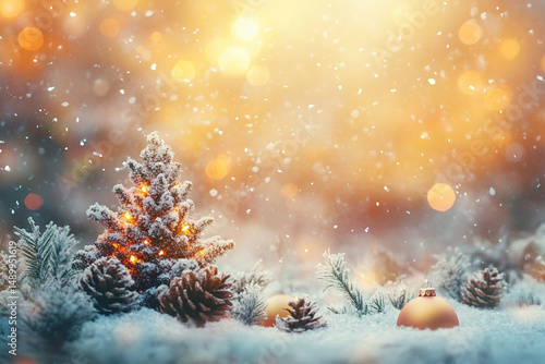 Christmas tree with glowing lights, snow-covered branches and pine cones surrounded by festive baubles in winter forest scene. Magical background, sparkling bokeh, holiday season greeting.