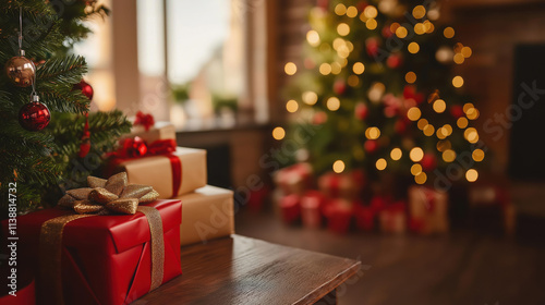 Christmas Tree with Wrapped Gift Boxes on a Table, Creating a Festive and Cozy Holiday Atmosphere