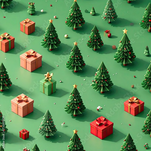 Christmas trees and gifts on a green background