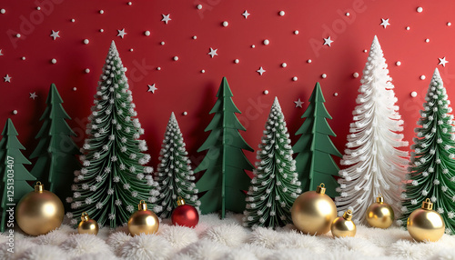 Christmas trees with gold ornaments and snow on red background