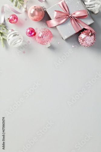 Christmas vertical banner design, poster template. Flat lay composition with gift box decorated pink ribbon bow, fir branches, baubles.