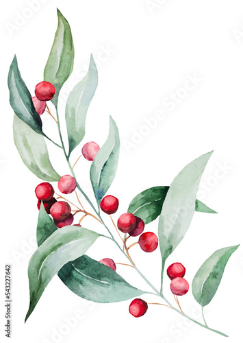 Christmas watercolor twig with green leaves and red berries. Holidays design Illustration