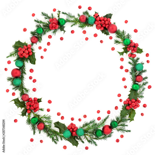 Christmas wreath abstract decoration with winter flora of juniper fir and holly with red and green baubles and loose berries on white background. Decorative symbol for the festive season.