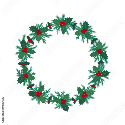 Christmas wreath design with pin branches and holly berries. Vector illustration