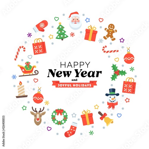Christmas wreath of flat seasonal pictograms with New Year inscription