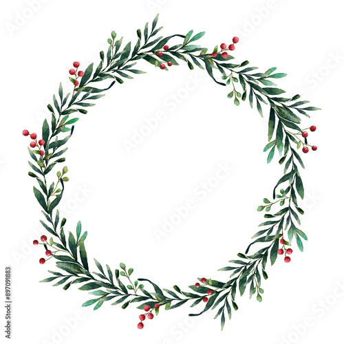 Christmas wreath png frame, watercolor aesthetic illustration on transparent background