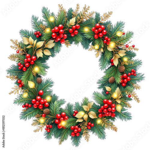 Christmas wreath with pine branches, berries, golden leaves, and glowing lights vector illustration on white