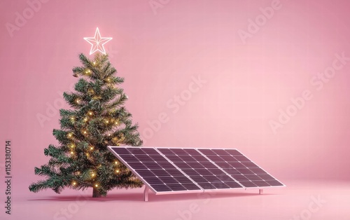 christmass tree and solar panel on pink background