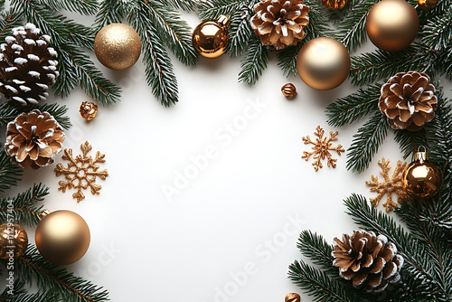 Christmas-themed flat lay with pine branches, golden ornaments, and snowflakes on a white background. Clean layout with space for text, perfect for holiday greetings