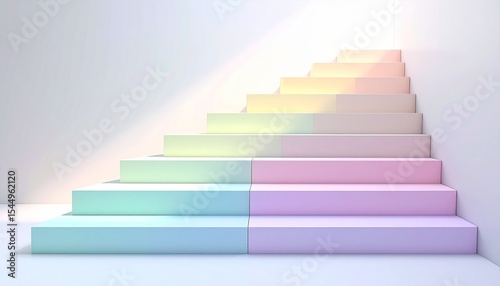Chromatic panels arranged in a stepped formation, each glowing in punchy pastel tints under a diffused white spotlight.