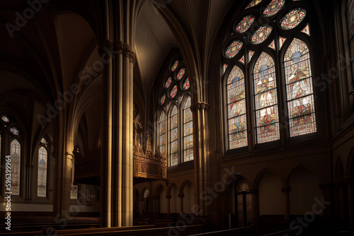 Chruch from the inside, beautiful colored windows, Ai generated