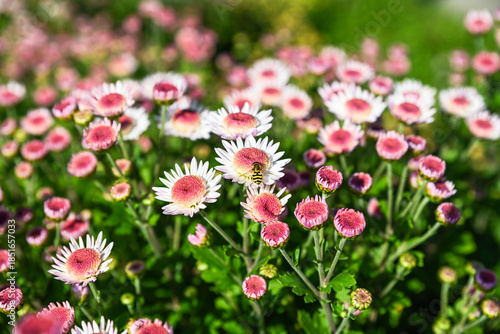 Chrysanthemum Medea flowers blooming in garden with pink centers white petals and a hoverfly on blossom natural floral background