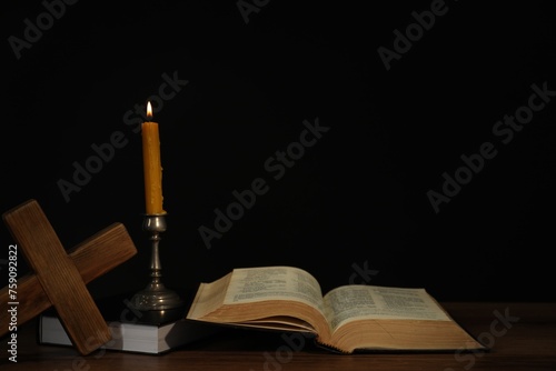 Church candle, Bible and cross on wooden table against black background, space for text