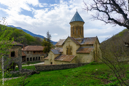 Church in the courtyard of the Kvatakhevi monastery. Stone walls, tiled roof. Stone paths, green grass, bright blue sky.