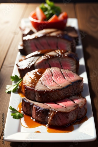 Churrasco de carne mal passada servido num prato retangular acompanhado de folhas, ervas e molho madeira sobre uma mesa.