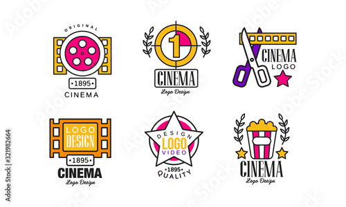 Cinema Logo Design Templates Collection, Bright Original Vintage Cinematography Badges Vector Illustration