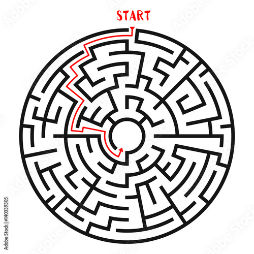 Circle Maze with Solution. Labyrinth with Entry and Exit. Find the Way Out Concept. Vector Illustration.