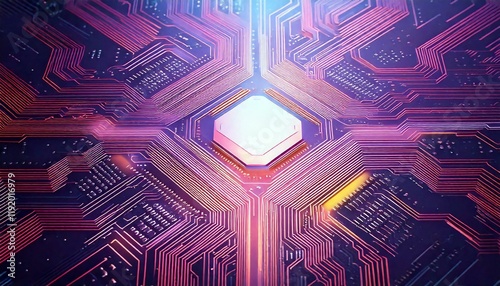 circuit board with softly shimmering pathways and glowing chips