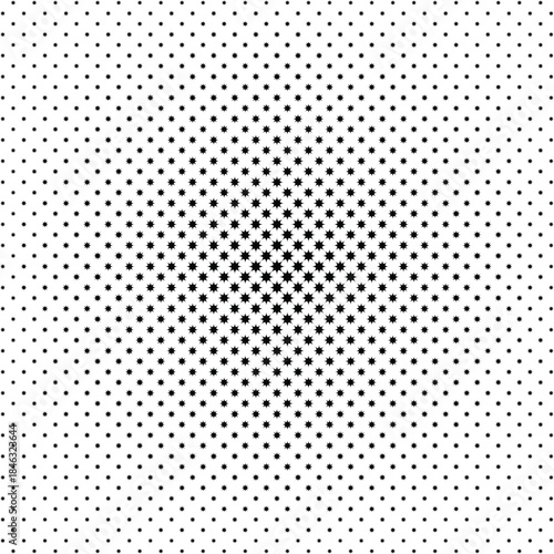 Circular halftone vector template of black dots gradually decreasing from the center to the edge. Lattice gradient transition. Particles dispersing radially.