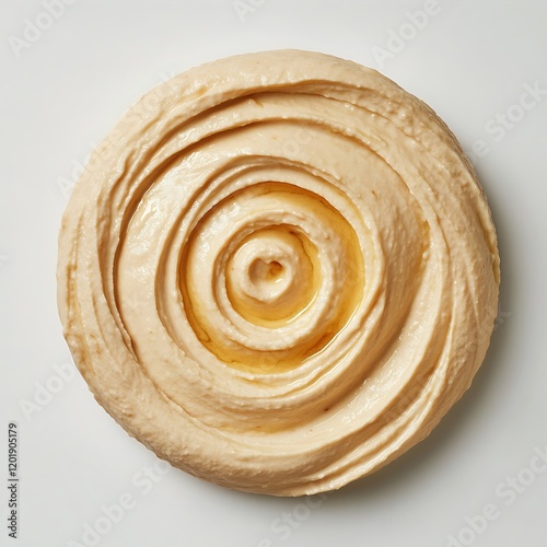Circular Swirl of Creamy Hummus with Golden Olive Oil on a White Surface Plate Top Down View
