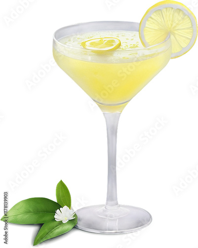Citrus Drink. Yellow lemon cocktail glass with blossom leaves garnish
