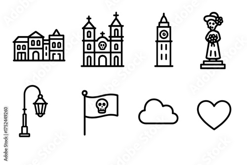 City architecture line icon set. buildings, landmarks, and symbols in outline style.