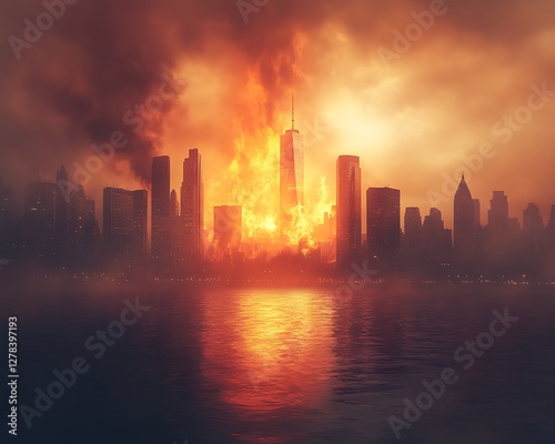 City burning, fiery sunset, waterfront