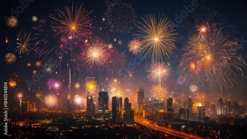 City skyline ablaze with colorful fireworks bursting across a dark night sky