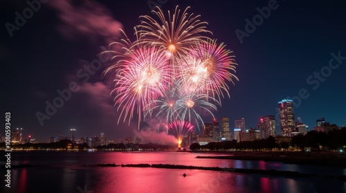 City Skyline Illuminated by Vibrant Fireworks with Reflections