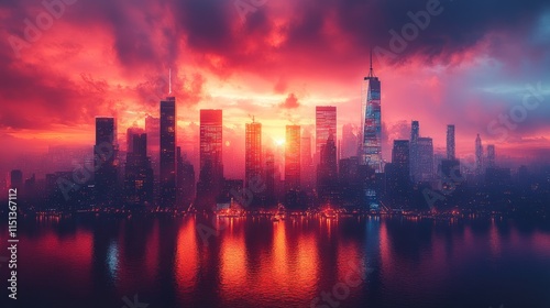 City skyline reflected in red sunset water.