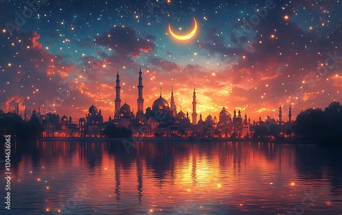 City Skyline with Minarets and Crescent Moon at Sunset