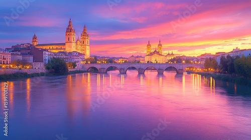 Cityscape at sunset over river with cathedral
