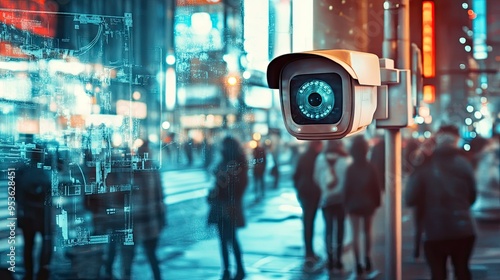 Cityscape featuring an HD surveillance camera with advanced facial recognition and AI technology, tracking and controlling pedestrian activity for improved safety.
