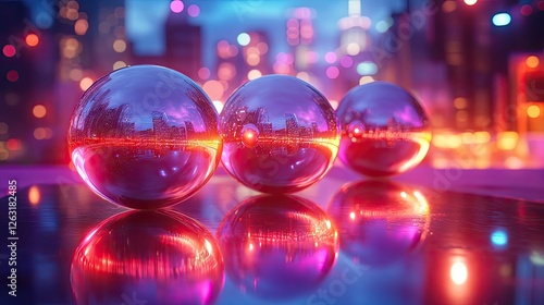 Cityscape reflections in three glass spheres at night